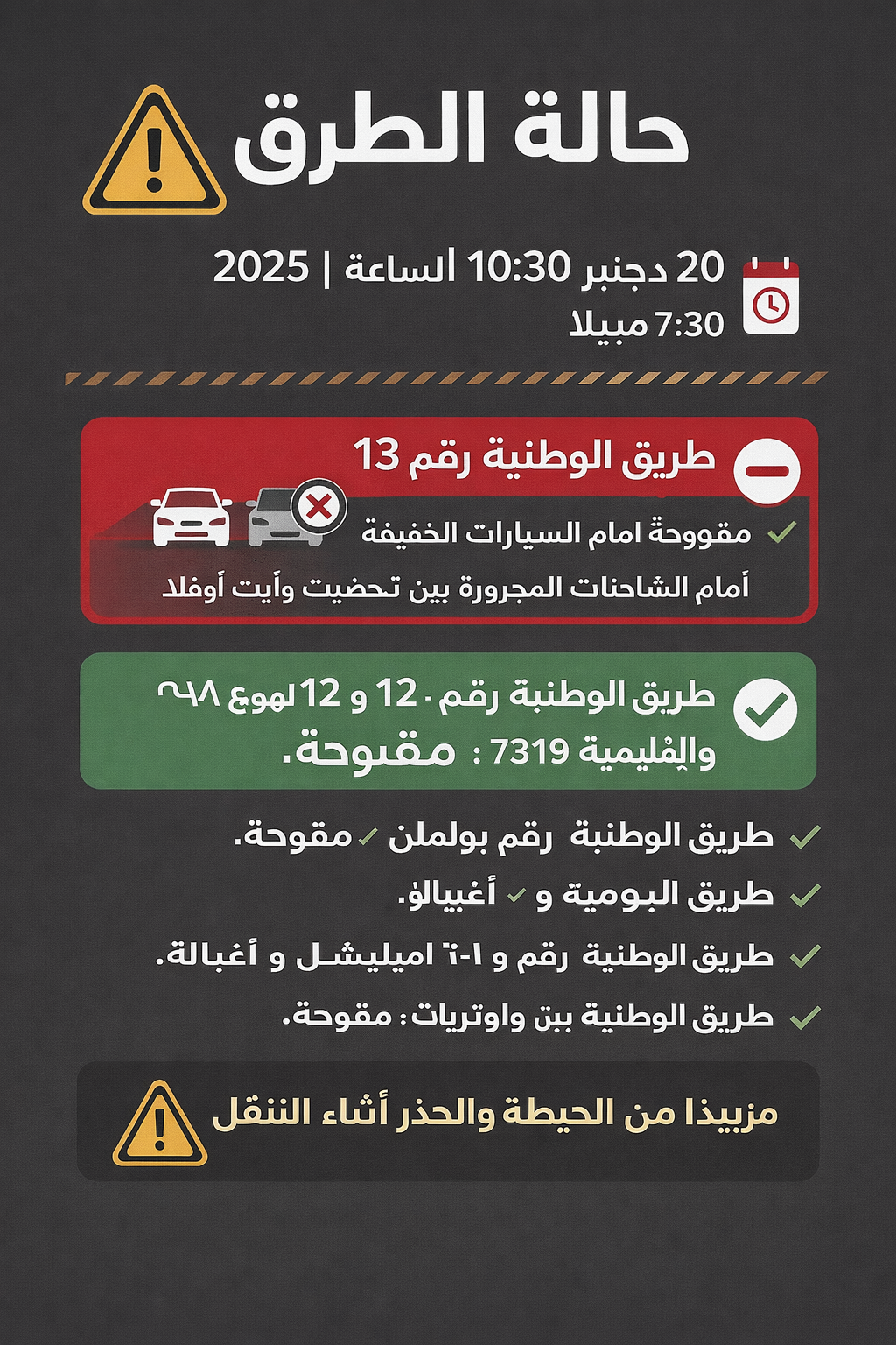 🚧 حالة الطرق الرئيسية📅 20 دجنبر 2025⏰ الساعة 10:30 ليلاً 1️⃣ الطريق الوطنية رقم 13 ...